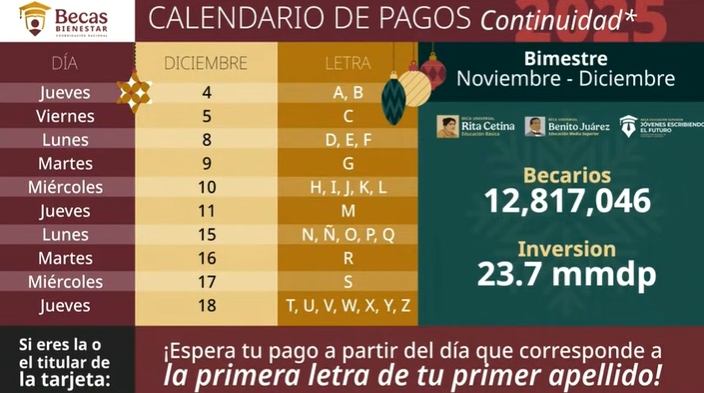 El Gobierno de México, a través de la Coordinación Nacional de Becas para el Bienestar Benito Juárez (CNBBBJ), presentó el calendario de pagos del bimestre noviembre-diciembre para los beneficiarios de las becas Rita Cetina, Benito Juárez y Jóvenes Escribiendo el Futuro.