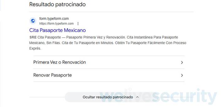 El primer paso de la estafa es cuando el usuario buscaba “cita para pasaporte mexicano” y, entre los primeros resultados, se encontraba con un enlace patrocinado que aparentaba pertenecer al portal oficial.