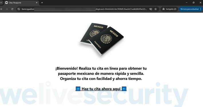 La empresa de ciberseguridad ESET Latinoamérica alertó este lunes 26 de enero sobre un sitio web fraudulento que intentó engañar a personas interesadas en tramitar el pasaporte mexicano. La página ya fue dada de baja; sin embargo, los expertos no descartan que los ciberatacantes migren rápidamente a una nueva URL para continuar con el fraude.