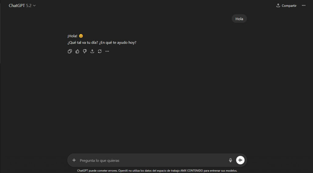 “¡Hola! ¿Qué tal va tu día? ¿En qué te ayudo hoy?“, respondió.