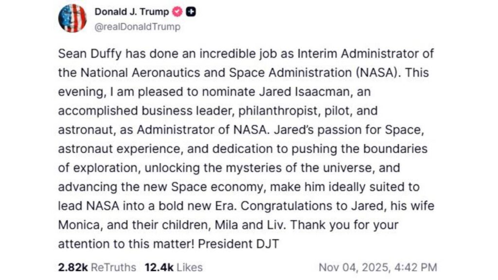 El presidente de Estados Unidos, Donald Trump, nominó nuevamente al empresario multimillonario y exastronauta Jared Isaacman, allegado a Elon Musk como director de la Administración Nacional de Aeronáutica y el Espacio (NASA, por sus siglas en inglés) informó el martes a través de su red social Truth Social.