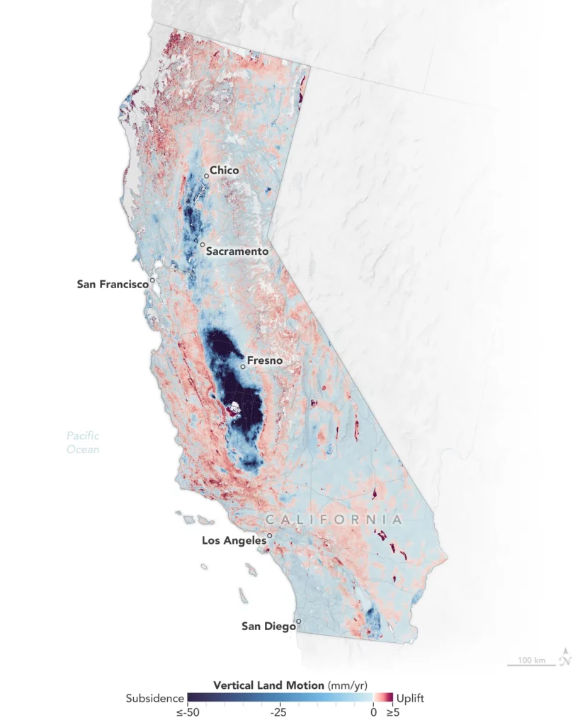 En medio de California, en las partes de rápido hundimiento del Valle Central (que se encuentran hasta 20 centímetros por año), el movimiento de la tierra está influenciado por la retirada de aguas subterráneas, informó la NASA.