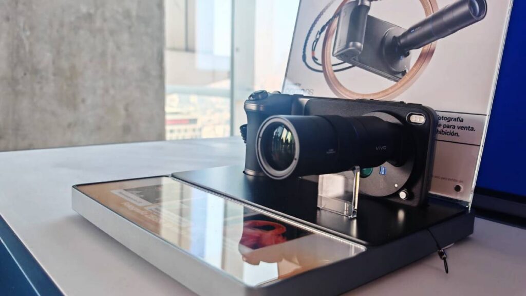 Kit Extensor de Teleobjetivo vivo Zeiss 2.35x y kit profesional de fotografía, se compone de una carcasa que se coloca al Vivo X300 Pro para que se le pueda agregar el lente de Zeiss. El teleobjetivo es de gran apertura que captura escenas a la distancia.