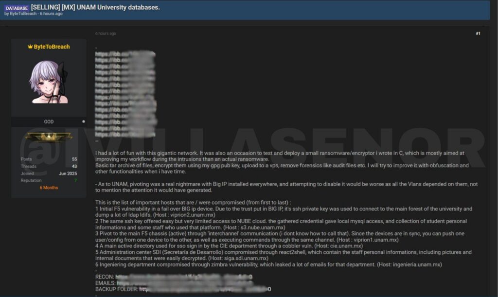 La información fue difundida a través de un hilo en la red social X por el periodista Ignacio Gómez Villaseñor, conocido por sus investigaciones en temas de política, corrupción y análisis tecnológico. En sus publicaciones se detalla una intrusión atribuida al ciberdelincuente identificado como “ByteToBreach“, vinculado previamente con la venta de datos en foros clandestinos.