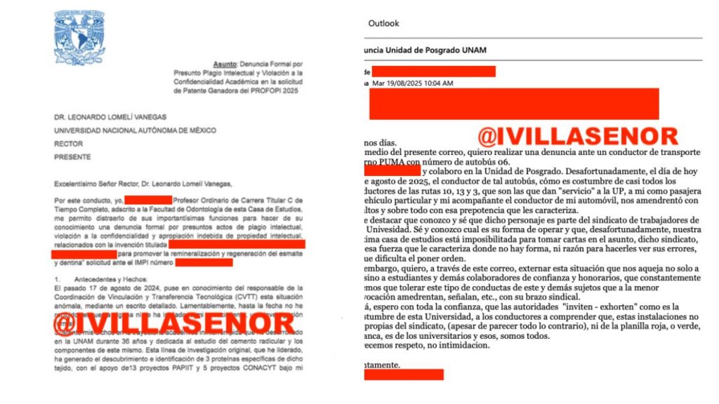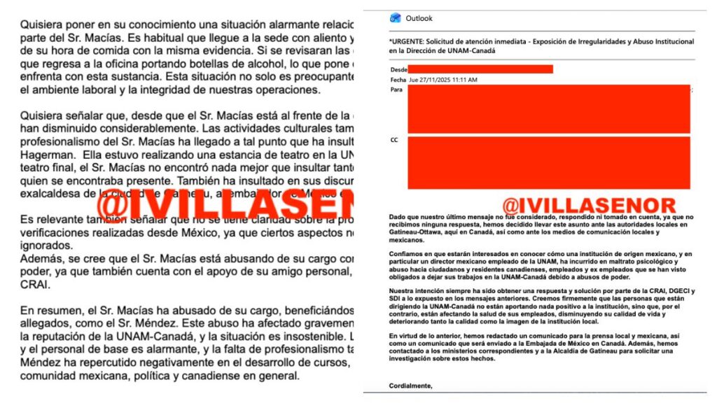 Entre los documentos presuntamente expuestos se encuentran denuncias graves contra Constantino Macías García, director de la sede UNAM Canadá, donde se documentan señales de acoso laboral y conductas inapropiadas que habrían sido conocidas por instancias internas sin una respuesta. Ante la falta de acción, algunas denuncias habrían sido llevadas a autoridades extranjeras, lo que habría escalado el conflicto a un plano internacional.