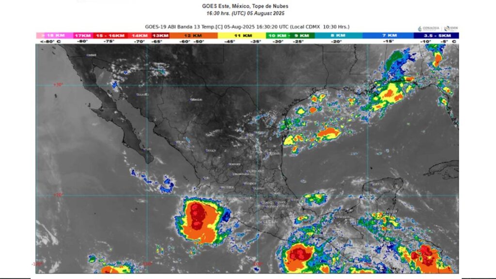 La Conagua y el SMS ofrecen una vista animada del tope de nubes y viento de los fenómenos en curso. Así como un informe pormenorizado de su trayectoria, efectos y pronósticos para los días y horas futuros.