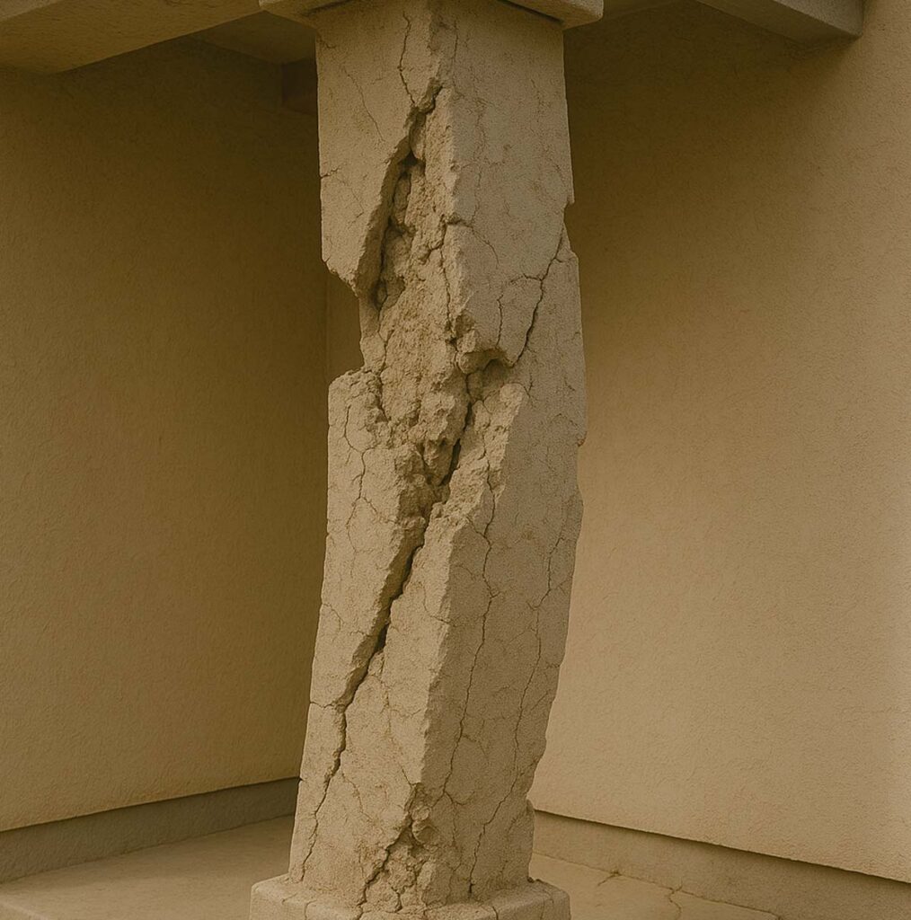 Las columnas son los pilares de un edificio. Una columna visiblemente inclinada, con grietas verticales o desprendimiento de recubrimiento, podría estar al borde del colapso. Esto es motivo inmediato para evacuar y reportar a Protección Civil.