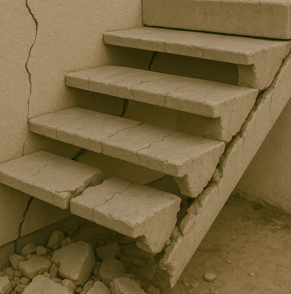 Una escalera que se ha desplazado, agrietado o separado del resto de la estructura indica que el edificio tuvo deformaciones importantes. Esto representa riesgo para la circulación y puede indicar movimientos graves en los entrepisos.