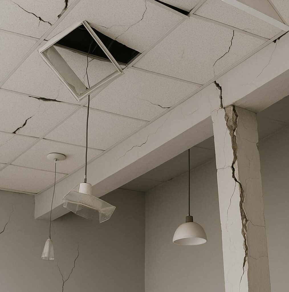 Canceles, vidrios, plafones, lámparas colgantes o ductos que se hayan desprendido representan un riesgo para los ocupantes, aunque no afecten directamente la estructura. Son la causa más común de lesiones en escuelas y oficinas.