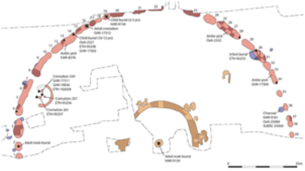 Se encontraron al menos cuatro enterramientos colocados en los pozos del recinto (un adulto incinerado y tres niños que no habían sido incinerados) y hubo otras tres cremaciones parciales de adultos en otros lugares.