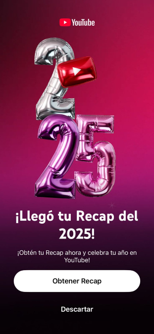 YouTube Recap 2025 es una herramienta que muestra al usuario el historial de reproducciones que tuvo a lo largo del año. Se muestra mediante un conjunto de hasta 12 tarjetas diferentes que destacan los canales principales, intereses y hasta la evolución de los hábitos de visualización, así como el tipo de personalidad según los videos que le encantó mirar al dueño del perfil.