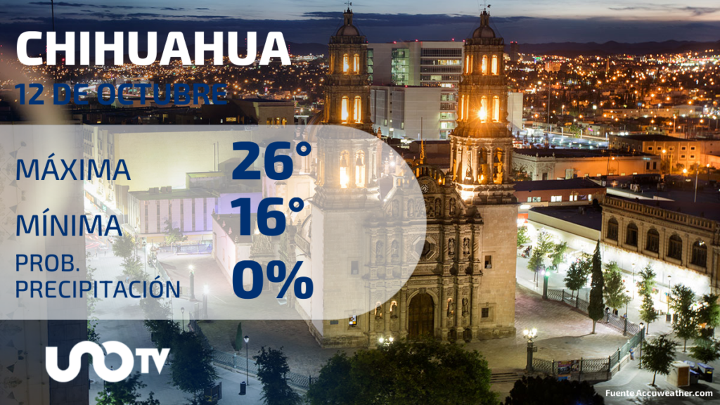 En la ciudad de Chihuahua, capital del estado homónimo, ubicada en la zona noroeste del país, el pronóstico del clima para el jueves 12 de octubre del 2023, indica que se espera una temperatura máxima de 26 grados Celsius, mientras que la mínima sería de 16 grados Celsius.