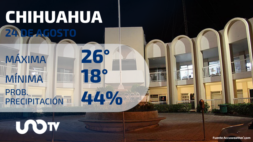 En el municipio de Ciudad Juárez, considerada la ciudad más poblada de Chihuahua y a la vez un importante punto fronterizo con EU, las previsiones del clima indican que durante el día del 24 de agosto habrá una temperatura máxima de 24 grados Celsius, mientras que la mínima pronosticada será de 19 grados Celsius durante la noche. La probabilidad de lluvia indica un 95% de que se produzcan lluvias en este municipio de Chihuahua.
