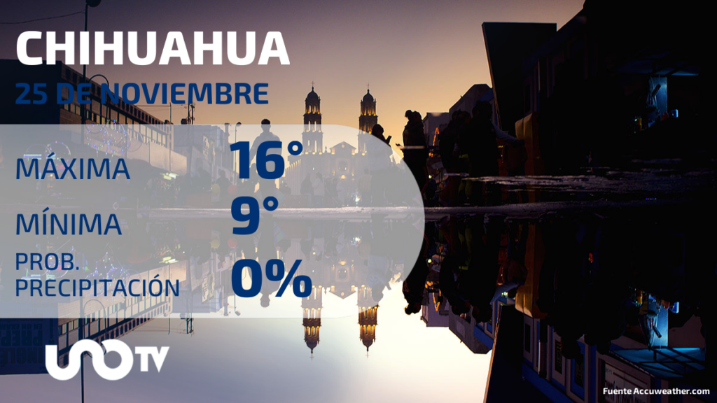 En la ciudad de Chihuahua, capital del estado homónimo, situada en la zona noroeste del país, el pronóstico del clima para el sábado 25 de noviembre del 2023, indica que se espera una temperatura máxima de 16 grados Celsius, mientras que la mínima sería de 9 grados Celsius.