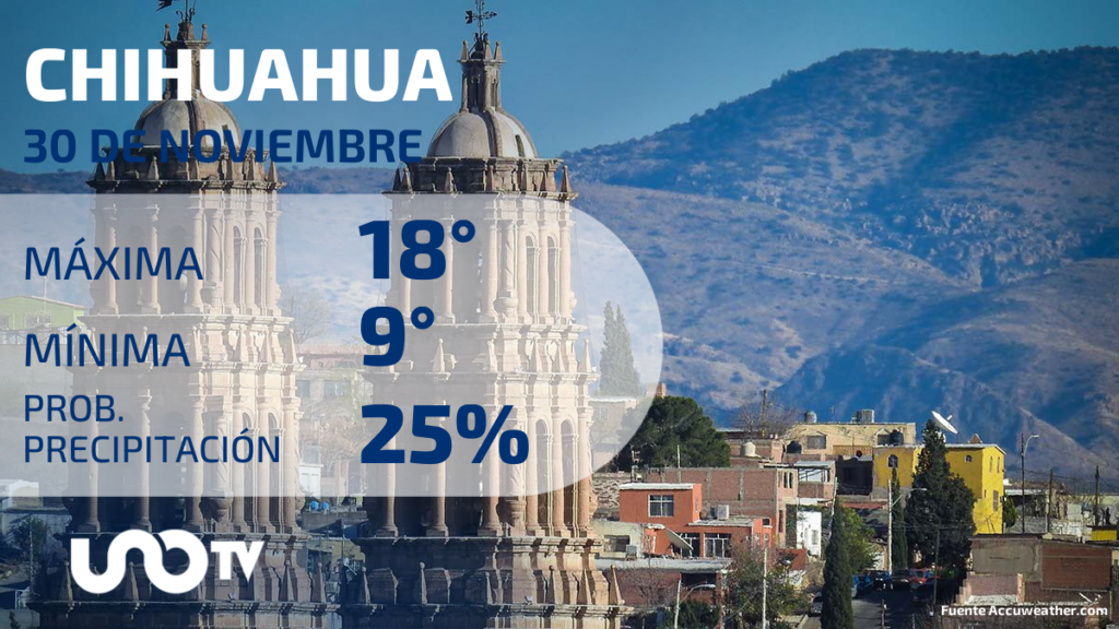 En el municipio de Ciudad Juárez, considerada la urbe más poblada de Chihuahua y al mismo tiempo un importante punto fronterizo con los Estados Unidos, las previsiones del clima indican que durante el día del 30 de noviembre se presentará una temperatura máxima de 17 grados Celsius, mientras que la mínima pronosticada será de 11 grados Celsius durante la noche. La probabilidad de lluvia indica un 0% de que se produzcan precipitaciones en este municipio de Chihuahua.