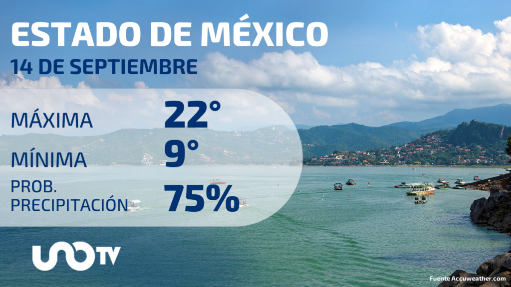 En el Estado de México, ubicado en la zona central de la República Mexicana, el pronóstico del clima para el jueves 14 de septiembre del 2023, indica que se espera una temperatura máxima de 22 grados Celsius en su capital, Toluca, mientras que la mínima sería de 9 grados Celsius.
