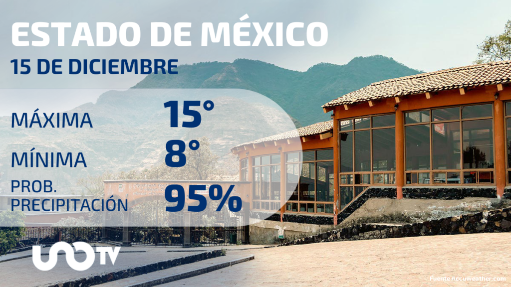 En el Estado de México, entidad con mayor población del país, el pronóstico del clima para el viernes 15 de diciembre del 2023, indica que se espera una temperatura máxima de 15 grados Celsius en su capital, Toluca, mientras que la mínima sería de 8 grados Celsius.