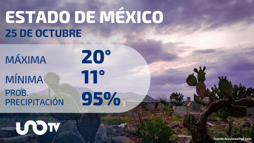 En el Estado de México, localizada en la meseta central del país, el pronóstico del clima para el miércoles 25 de octubre del 2023, indica que se espera una temperatura máxima de 20 grados Celsius en su capital, Toluca, mientras que la mínima sería de 11 grados Celsius.