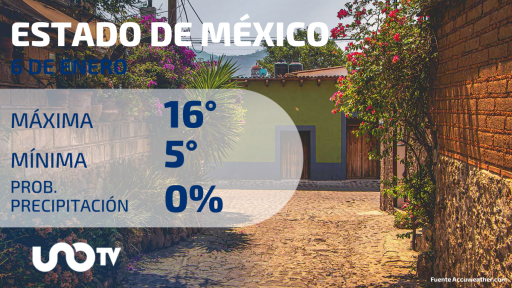 En el Estado de México, situado en la meseta central del país, el pronóstico del clima para el sábado 6 de enero del 2024, indica que se espera una temperatura máxima de 16 grados Celsius en su capital, Toluca, mientras que la mínima sería de 5 grados Celsius.