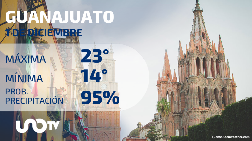 En el municipio de San Miguel de Allende, otro de los principales destinos turísticos de México, las previsiones del tiempo indican que durante el día del 1 de diciembre se registrará una temperatura máxima de 24 grados Celsius, mientras que la mínima pronosticada será de 14 grados Celsius en la noche. La probabilidad de lluvia indica un 95% de que se produzcan precipitaciones en este municipio de Guanajuato.