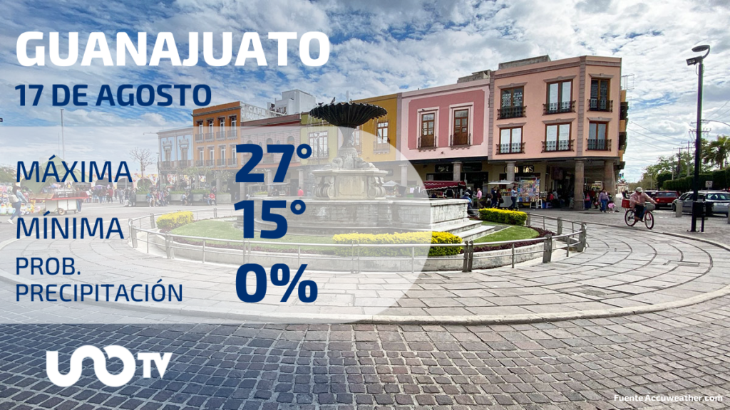 En la ciudad de Guanajuato, capital del estado homónimo, ubicada en el Bajío que se encuentra en la región centronorte del país, el pronóstico del clima para el jueves 17 de agosto del 2023, indica que se espera una temperatura máxima de 27 grados Celsius, mientras que la mínima sería de 15 grados Celsius.