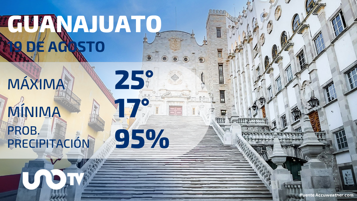 Las previsiones del clima señalan que en el municipio de Irapuato, considerada la segunda ciudad más poblada de Guanajuato, se espera una máxima de 30 grados Celsius durante la tarde del 19 de agosto; por otra parte, en la noche se presentará la mínima estimada en 18 grados Celsius. La probabilidad de lluvia es del 95%.