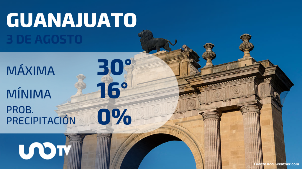 En la ciudad de Guanajuato, capital del estado homónimo, situada en el Bajío que se encuentra en la región centronorte del país, el pronóstico del clima para el jueves 3 de agosto del 2023, indica que se espera una temperatura máxima de 30 grados Celsius, mientras que la mínima sería de 16 grados Celsius.