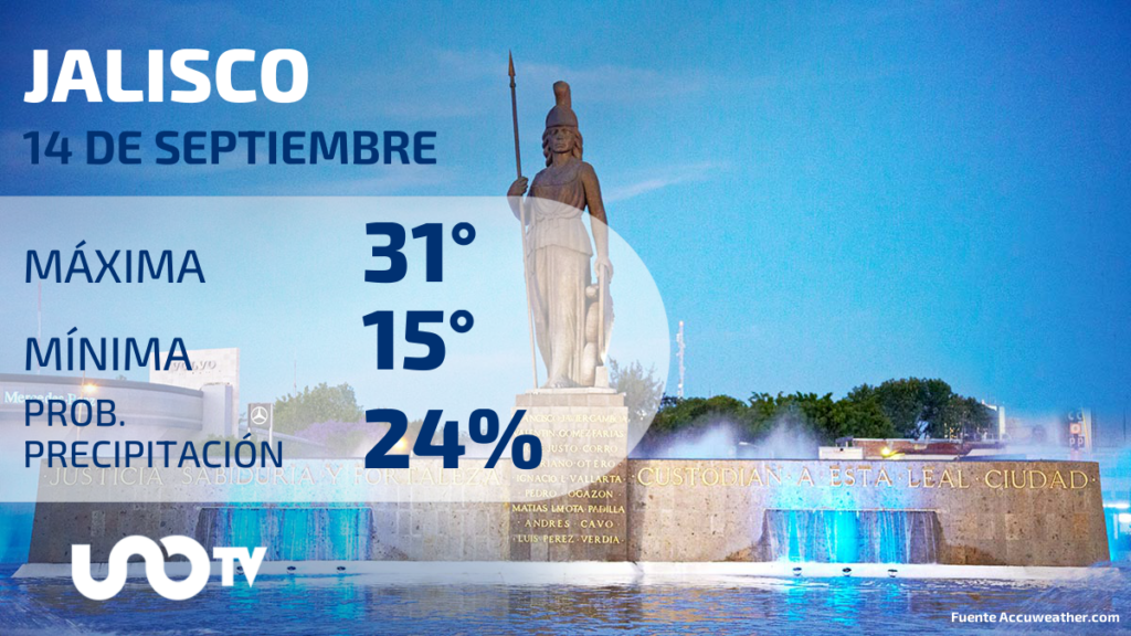 En la ciudad de Guadalajara, capital del estado de Jalisco, situada en la zona oeste del país, el pronóstico del clima para el jueves 14 de septiembre del 2023, indica que se espera una temperatura máxima de 31 grados Celsius, mientras que la mínima sería de 15 grados Celsius.
