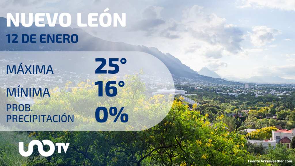 En la ciudad de Monterrey, capital del estado de Nuevo León, localizada en la costa del Atlántico, en el Golfo de México, el pronóstico del clima para el viernes 12 de enero del 2024, indica que se espera una temperatura máxima de 25 grados Celsius, mientras que la mínima sería de 16 grados Celsius.