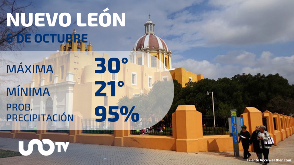 En la ciudad de Monterrey, capital del estado de Nuevo León, ubicada en la costa del Atlántico, en el Golfo de México, el pronóstico del clima para el viernes 6 de octubre del 2023, indica que se espera una temperatura máxima de 30 grados Celsius, mientras que la mínima sería de 21 grados Celsius.