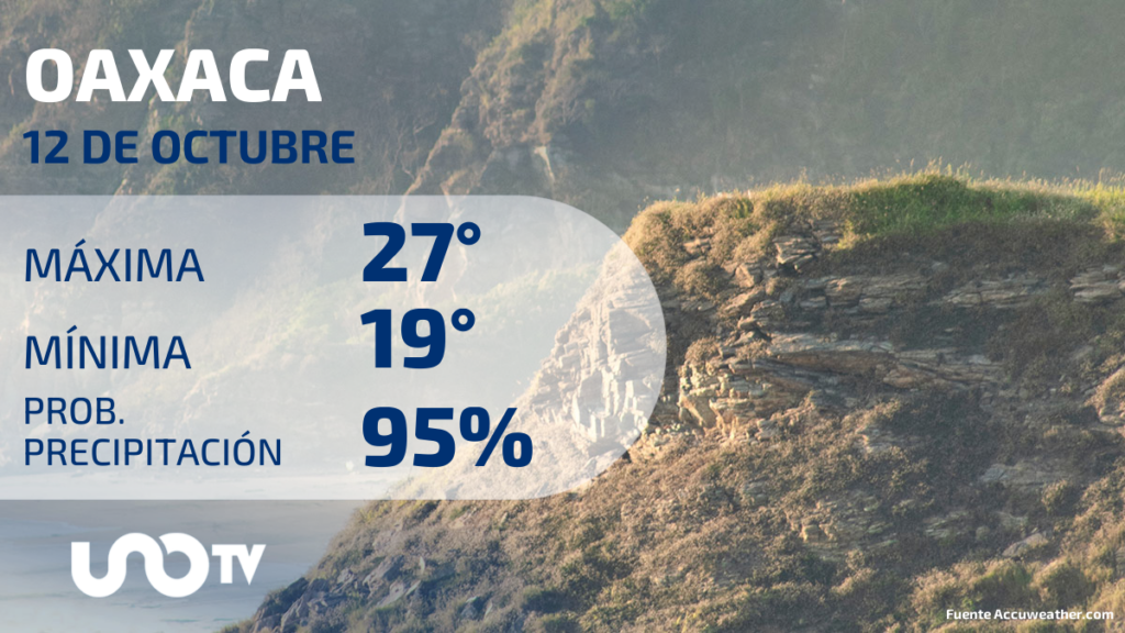 En la ciudad de Oaxaca, capital del estado homónimo, el pronóstico del clima para el jueves 12 de octubre del 2023, indica que se espera una temperatura máxima de 27 grados Celsius, mientras que la mínima sería de 19 grados Celsius.