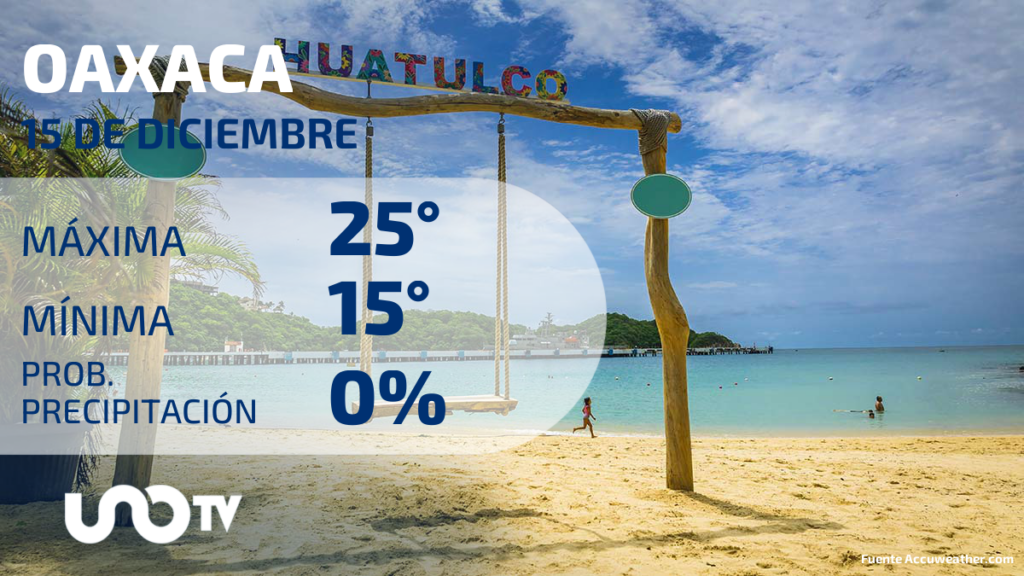 En el municipio de Huatulco, gran sitio turístico en México por sus bahías para hacer surf y cruceros, las previsiones del clima indican que durante el día del 15 de diciembre se presentará una temperatura máxima de 31 grados Celsius, mientras que la mínima prevista será de 26 grados Celsius durante la noche. La probabilidad de lluvia indica un 0% de que se produzcan precipitaciones en este municipio de Oaxaca.