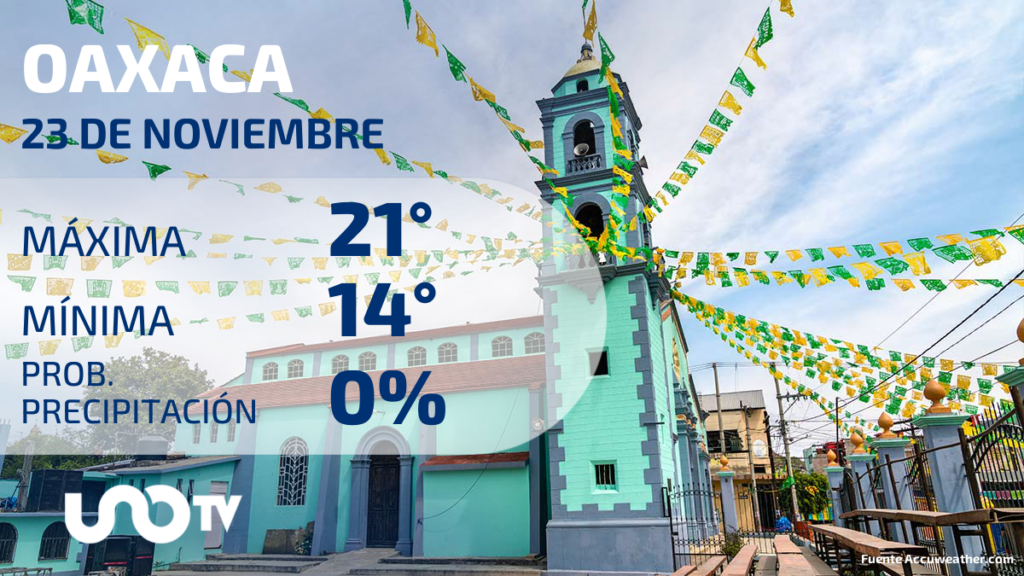 En la ciudad de Oaxaca, capital del estado homónimo, el pronóstico del clima para el jueves 23 de noviembre del 2023, indica que se espera una temperatura máxima de 21 grados Celsius, mientras que la mínima sería de 14 grados Celsius.