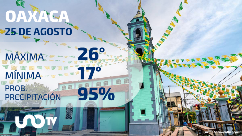 En la ciudad de Oaxaca, capital del estado homónimo, el pronóstico del clima para el viernes 25 de agosto del 2023, indica que se espera una temperatura máxima de 26 grados Celsius, mientras que la mínima sería de 17 grados Celsius.