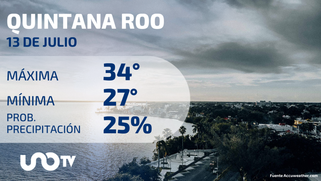 Las previsiones del clima indican que en el municipio de Cancún, otro popular destino turístico de Quintana Roo y ciudad más grande del estado, es el centro turístico mexicano más popular en el mundo. Durante la jornada de hoy la ciudad tendrá una temperatura máxima de 33 grados Celsius durante la tarde del 13 de julio; mientras, en la noche se presentará la mínima estimada en 27 grados Celsius. La probabilidad de lluvia es del 3%.