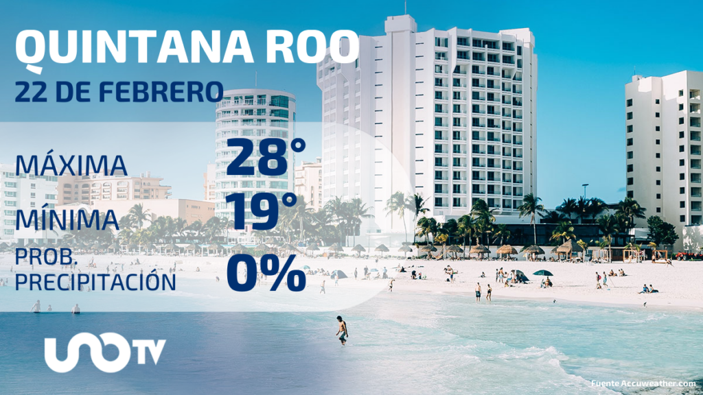 Las previsiones del clima indican que en el municipio de Cancún, otro conocido destino turístico de Quintana Roo y ciudad más grande del estado, es el centro turístico mexicano más popular en el mundo. Durante la jornada de hoy la ciudad espera una temperatura máxima de 27 grados Celsius durante la tarde del 22 de febrero; por otra parte, en la noche se presentará la mínima estimada en 17 grados Celsius. La probabilidad de precipitaciones es del 1%.