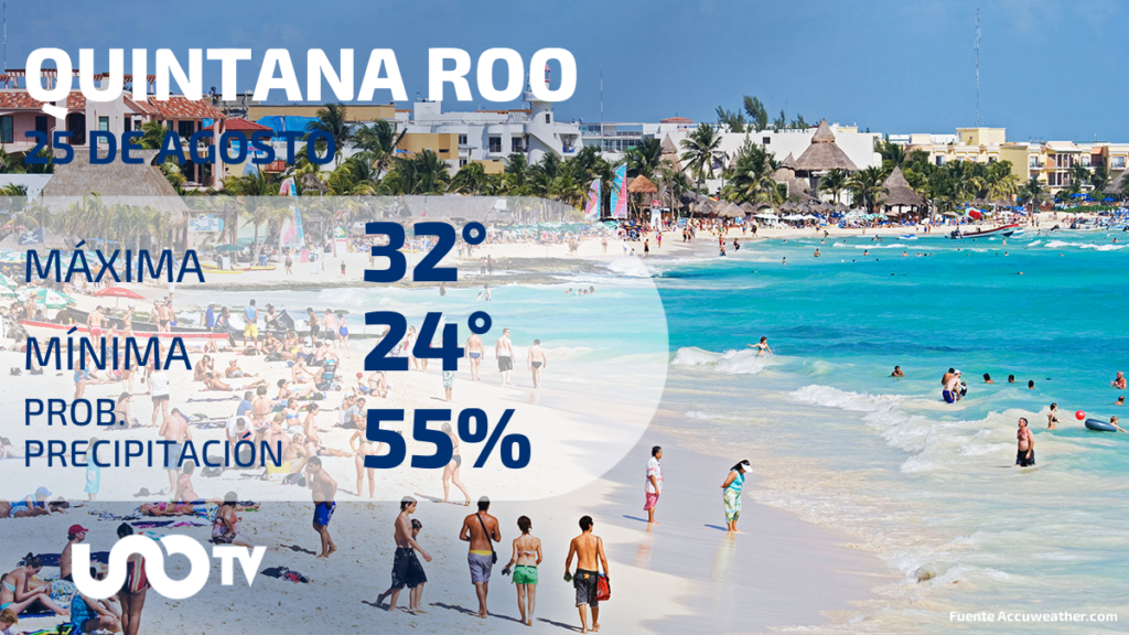 El informe meteorológico para Playa del Carmen, la segunda urbe más poblada del estado e importante lugar turístico por sus playas caribeñas, el día 25 de agosto del presente año anuncia una máxima de 31 grados Celsius durante el día, mientras que para la noche se espera una mínima de 26 grados Celsius, con tormentas eléctricas. La expectativa de lluvia en esta hermosa ciudad de la Riviera Maya es del 49%.