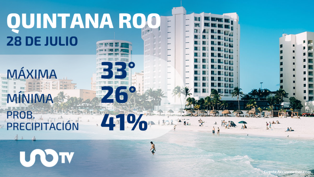 Las previsiones del clima señalan que en el municipio de Cancún, otro conocido lugar turístico de Quintana Roo y ciudad más grande del estado, es el centro turístico mexicano más reconocido en todo el mundo. Durante la jornada de hoy la ciudad espera una temperatura máxima de 33 grados Celsius durante la tarde del 28 de julio; por otra parte, en la noche la temperatura mínima estimada será de 27 grados Celsius. La probabilidad de lluvia es del 55%.