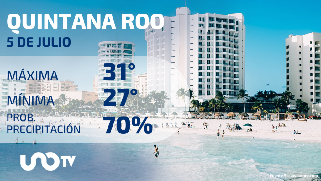 Los pronósticos climáticos indican que en el municipio de Cancún, otro popular lugar turístico de Quintana Roo y ciudad más grande del estado, es el centro turístico mexicano más reconocido en todo el mundo. Durante la jornada de hoy la ciudad tendrá una temperatura máxima de 33 grados Celsius durante la tarde del 5 de julio; por otra parte, en la noche tendremos mínimas estimadas de 27 grados Celsius. La probabilidad de precipitaciones es del 8%.