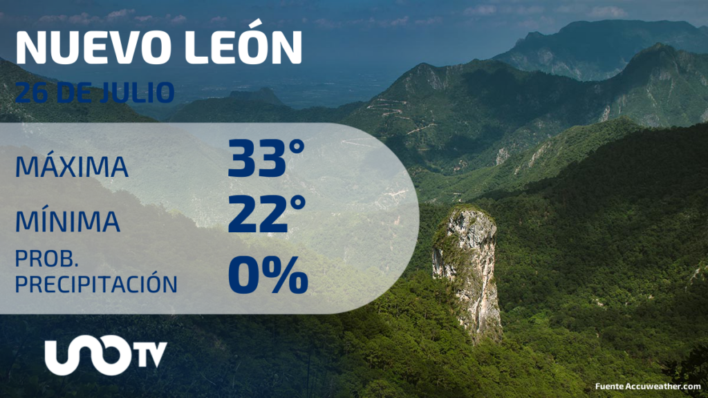 En la ciudad de Monterrey, capital del estado de Nuevo León, localizada en la costa del Atlántico, en el Golfo de México, el pronóstico del clima para el miércoles 26 de julio del 2023, indica que se espera una temperatura máxima de 33 grados Celsius, mientras que la mínima sería de 22 grados Celsius.