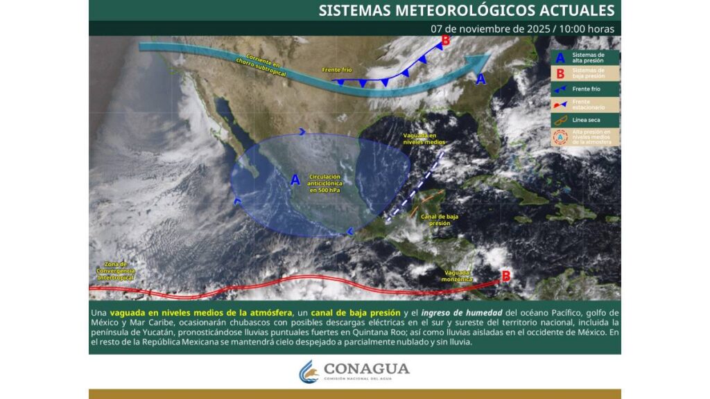 Este viernes, los efectos serán moderados con chubascos dispersos en el occidente, sur y sureste, principalmente en Guerrero, Oaxaca, Chiapas, Campeche y Yucatán, además de lluvias fuertes en Quintana Roo.