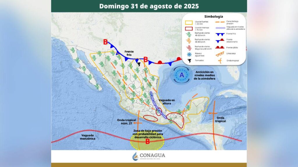 Durante el sábado, domingo y lunes, el posible ingreso del frente frío sobre el norte y noreste de México, una nueva onda tropical (la número 28), causarán precipitaciones.