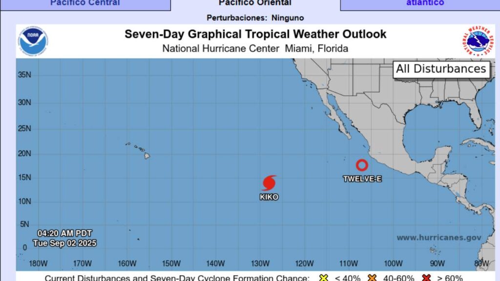 La madrugada de este 2 de septiembre de 2025, el huracán Kiko alcanzó la categoría 1 en la escala Saffir-Simpson, según el Centro Nacional de Huracanes de Estados Unidos (NHC). El fenómeno natural avanza por el océano Pacífico con vientos sostenidos de 120 km/h.
