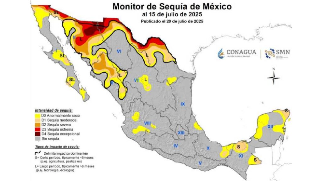 De acuerdo con el Monitor de Sequía, los estados con más lluvias se concentran en el centro y sur del país, mientras que al norte, entidades como Sonora, Chihuahua, Coahuila y Baja California siguen registrando bajos niveles de humedad en el suelo, con afectaciones en su población, agricultura y disponibilidad de agua.