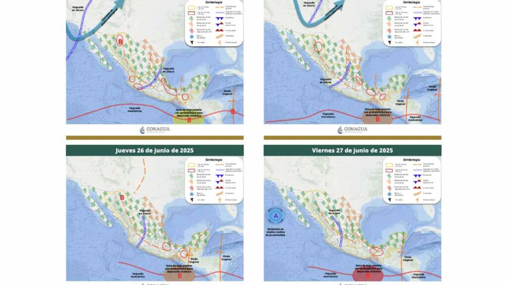 Diversos fenómenos como canales de baja presión, divergencia e ingreso de humedad de ambos océanos propiciarán las lluvias en México por, al menos, cuatro días, desde este martes y hasta el viernes 27 de junio.