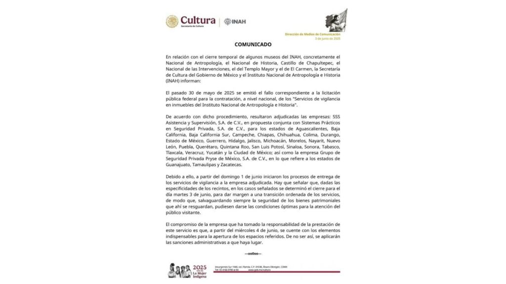 A través de un comunicado emitido el 3 de junio, el INAH dio a conocer que se emitió el fallo correspondiente a la licitación federal para la contratación, a nivel nacional de los “Servicios de vigilancia en inmuebles del Instituto Nacional de Antropología e Historia.
