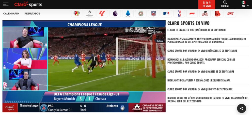 La renovada plataforma de Claro Sports también cuenta con el apartado “TV en vivo” en la parte superior de su página principal.