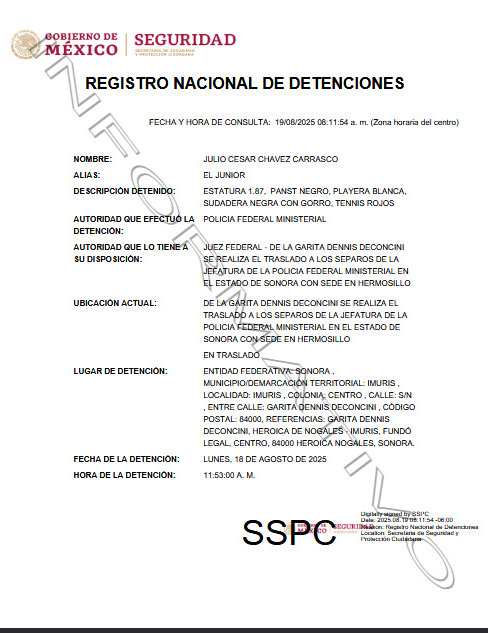 El Registro Nacional de Detenciones confirmó que Chávez Jr. fue asegurado en el municipio de Ímuris, Sonora, a las 11:53 horas del lunes 18 de agosto, y trasladado a la Jefatura de la Policía Federal Ministerial en Hermosillo.