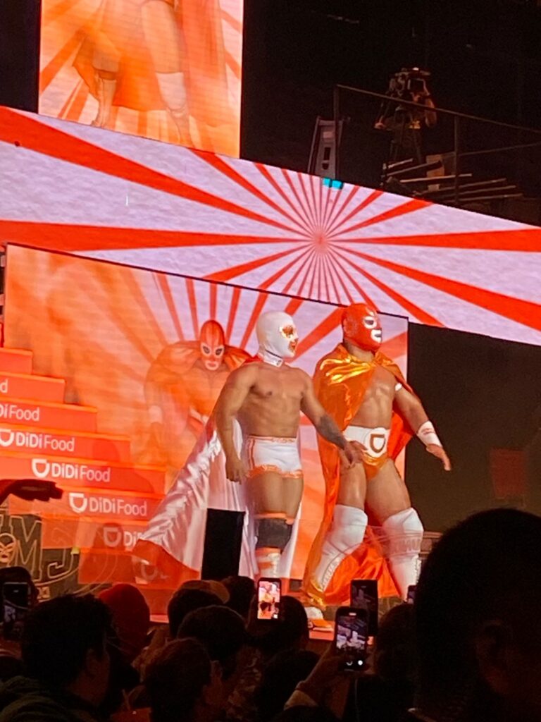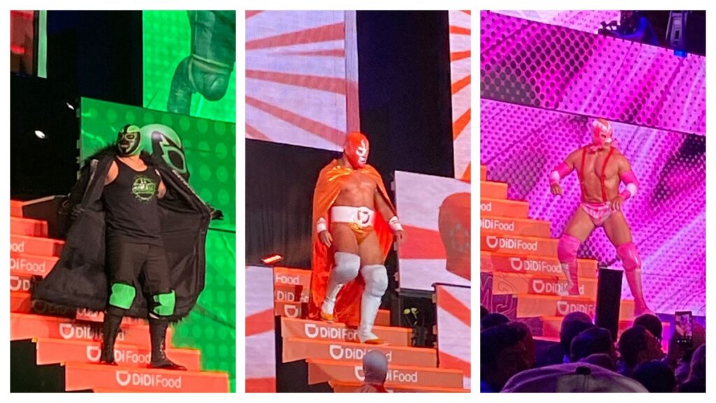 Y entonces llegó la lucha estelar, “Titán Naranja”. Con una capa estampada con el logo de DiDi, máscara (como la que portaba el público) combinada y un cinturón que no dejaba duda de su identidad, apareció decidido a llevarse la noche. Enfrente tenía no solo a “La Sombra” (un luchador de tonos verdes que evocaba a Uber) sino también al “Infierno Rosa”, que según La Cotorriza representaba quizá a los taxis de CDMX. Aunque al inicio los rudos hicieron alianza y por momentos estuvieron a punto de desenmascararlo, la ambición terminó traicionándolos comenzaron a pelear entre sí, dejando la puerta abierta para que Titán Naranja venciera a La Sombra con astucia y velocidad.