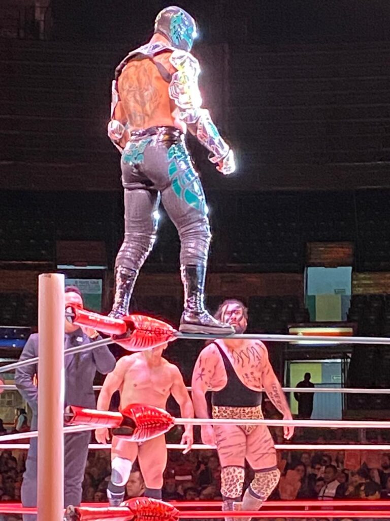 Los técnicos dominaron la velada. En una pelea electrizante, el “Alquimista del Ring” Hechicero, acompañado por Valiente y el “Rey del Garrote” Bárbaro Cavernario, se midieron contra el equipo formado por Titán, Templario y Neón. Antes del encuentro, el staff repartió dedos de espuma y máscaras naranjas, anticipando la sorpresa que vendría. Templario se llevó múltiples gritos de admiración por parte de La Cotorriza y del público, que no dejó de comentar su físico esculpido. Finalmente, los técnicos se llevaron la caída.